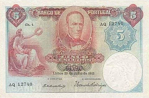 A taxa de conversão foi estabelecida em 1.000 Réis = 1 Escudo. Entre 1913 e 1920, o Banco de Portugal emitiu notas de 50 centavos, 1$00, 2$50, 5$00, 10$00, 20$00, 50$00. Até 1974 a nota de maior valor emitida foi de 1.000$00. A nota de 5$00 (cinco escudos) foi a 1ª nota emitida, em escudos, pelo Banco de Portugal em 13 de Julho de 1913.