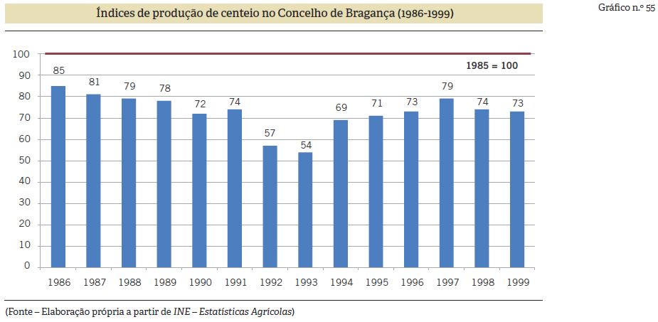 Sendo o centeio a principal cultura cerealífera do Concelho de Bragança, servindo não só para a produção de grão mas também para o fornecimento de palha indispensável à pecuária e à produção de estrumes para os campos, a referida redução observada na produção ao longo do período em referência foi menor do que a do trigo (Gráfico n.º 55).