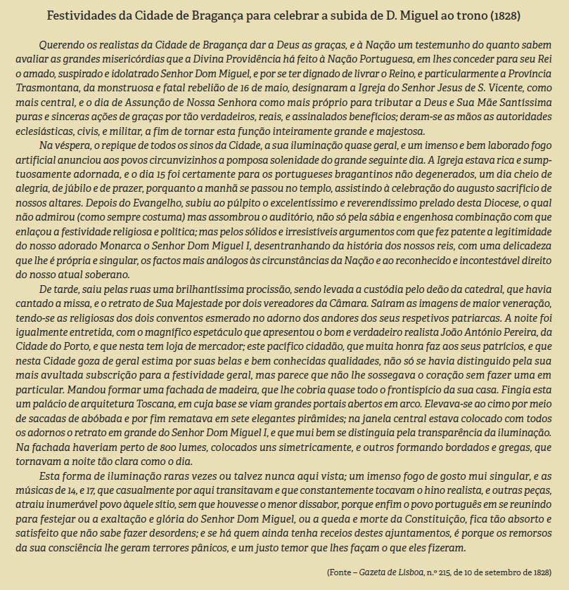 Na véspera, repicaram todos os sinos da Cidade, iluminaram-se os prédios e houve fogo de-artifício. Os “Portugueses Bragantinos não degenerados” tiveram um dia cheio de júbilo, ouvindo o bispo de Bragança com um sermão que “assombrou o auditório”, e participando na procissão que, pela tarde, percorreu as ruas da Cidade, com a custódia, os respetivos andores e o retrato de D. Miguel transportado por dois vereadores municipais. À noite, houve um “magnífico espetáculo” oferecido por um comerciante portuense que tinha loja em Bragança.