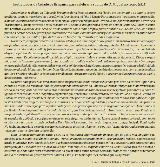 Um mês mais tarde, a 18 de outubro, é recebida por D. Miguel, no Palácio das Necessidades, em Lisboa, uma deputação da Câmara da Cidade de Bragança, para felicitar o Rei e lhe garantir a sua total fidelidade, lembrando que a sua cidade foi a primeira que na noite de 28 de julho de 1826, aclamou Miguel como “legítimo e absoluto Rei deste Reino”, e que, no dia 23 de novembro de 1828, ao entrar em Bragança, a Divisão Realista do marquês de Chaves viu habitantes do seu Município, aos milhares, “armados espontaneamente”, combaterem em defesa de D. Miguel.